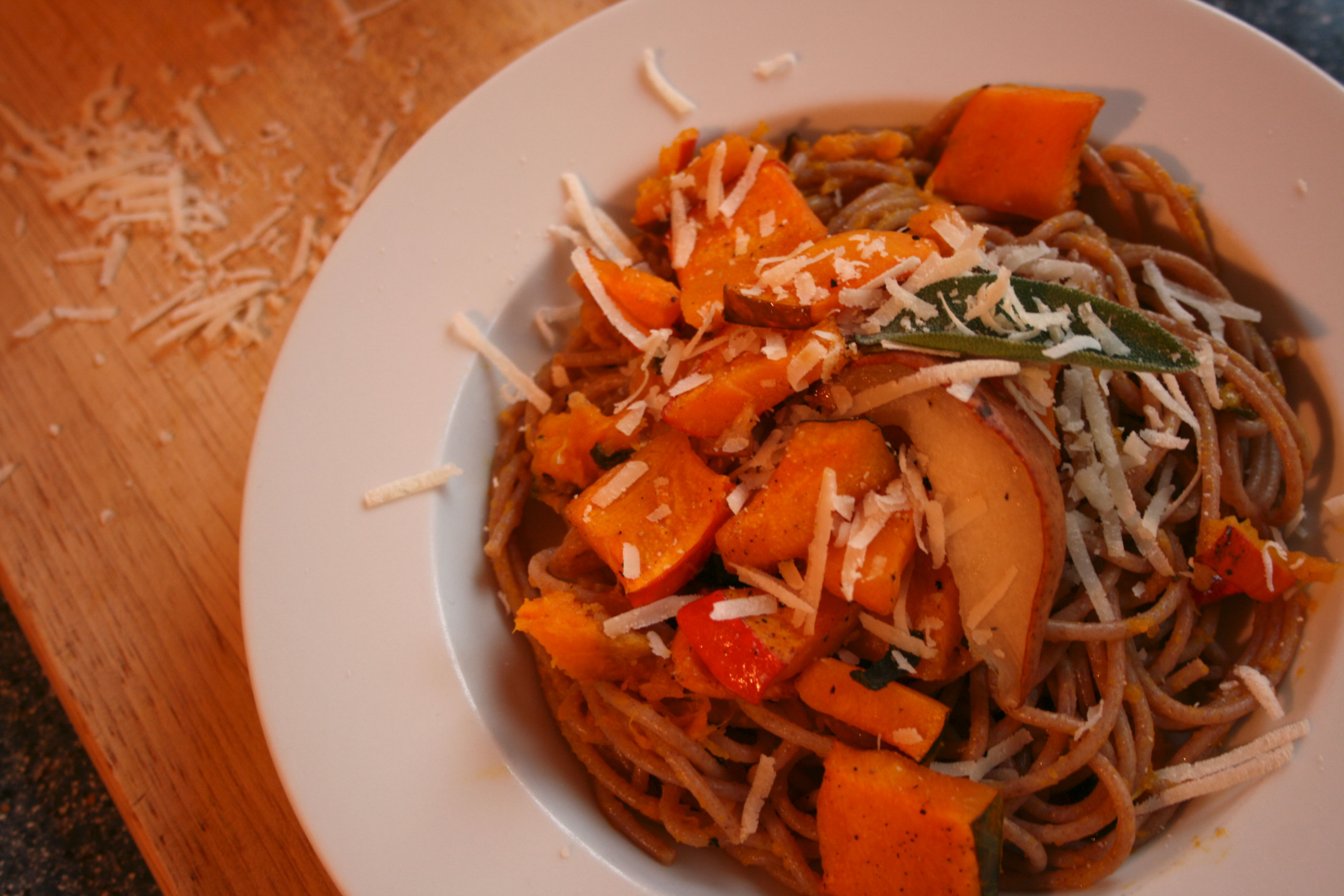 Das Ergebnis: Spaghetti di farro con zucca, pere e salvia, e parmigiano reggiano. Zu Deutsch: Dinkelspaghetti mit Kürbis, Birne und Salbei, darüber Parmigiano Reggiano.