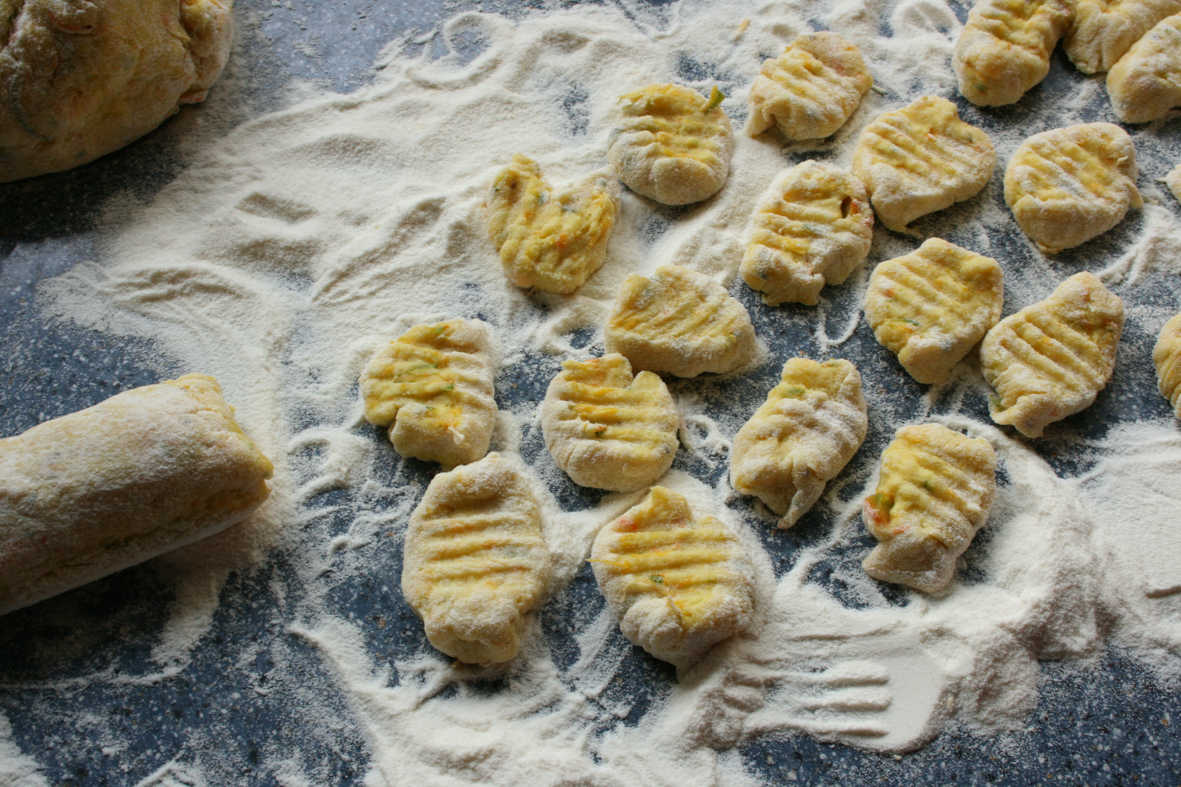 Teig in dünne Rollen formen, Stücke abschneiden und mit einer Gabel das typische Gnocchimuster eindrücken. In siedendem, gesalzenen Wasser für ca. 8 Minuten gar werden lassen, bis sie an der Oberfläche schwimmen (nicht kochen!).