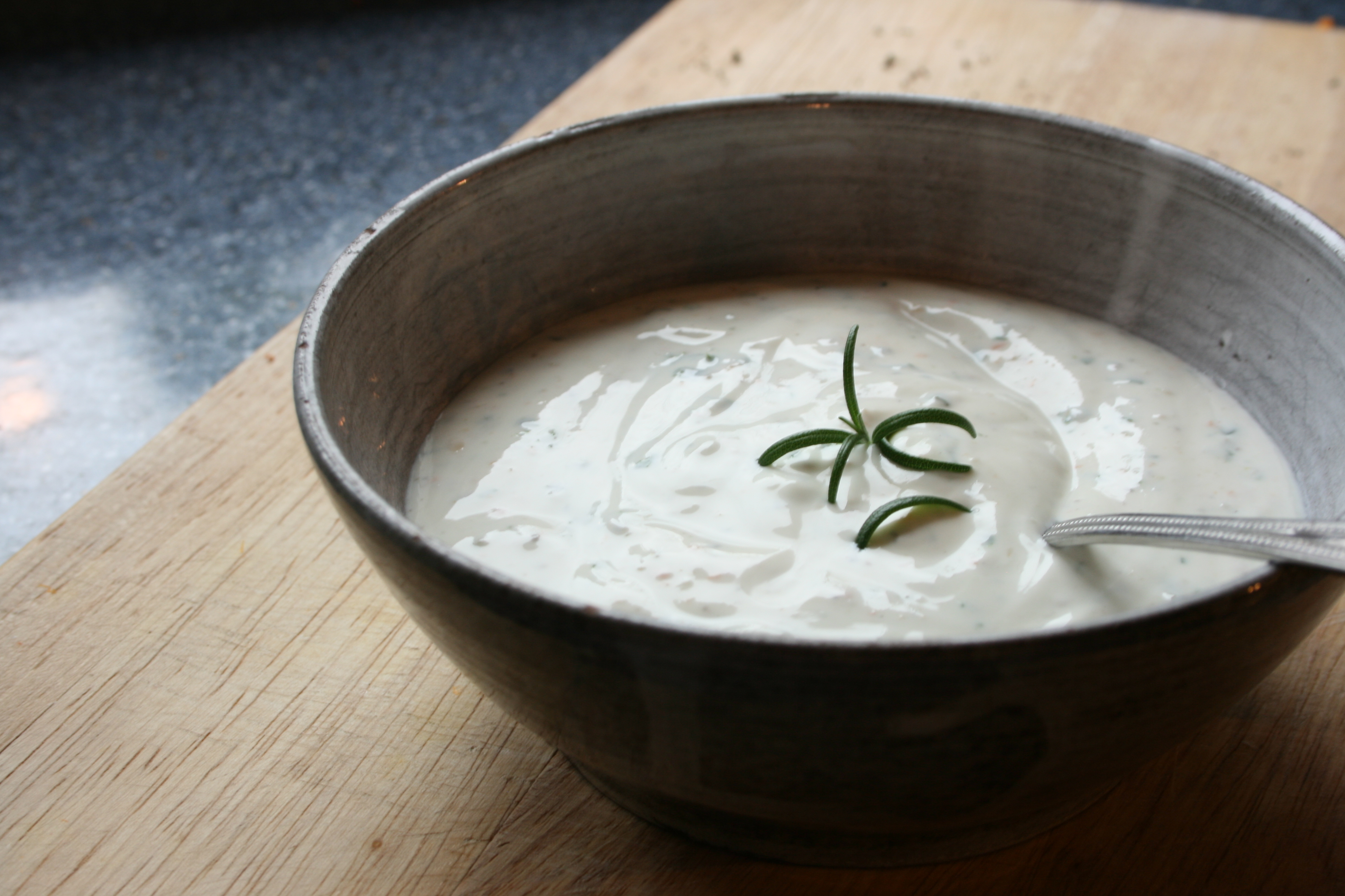Während alles im Ofen ist, Sauerrahmdip zubereiten. Dazu Sauerrahm und Joghurt verquirlen und mit Kräutern, Salz und Pfeffer abschmecken.