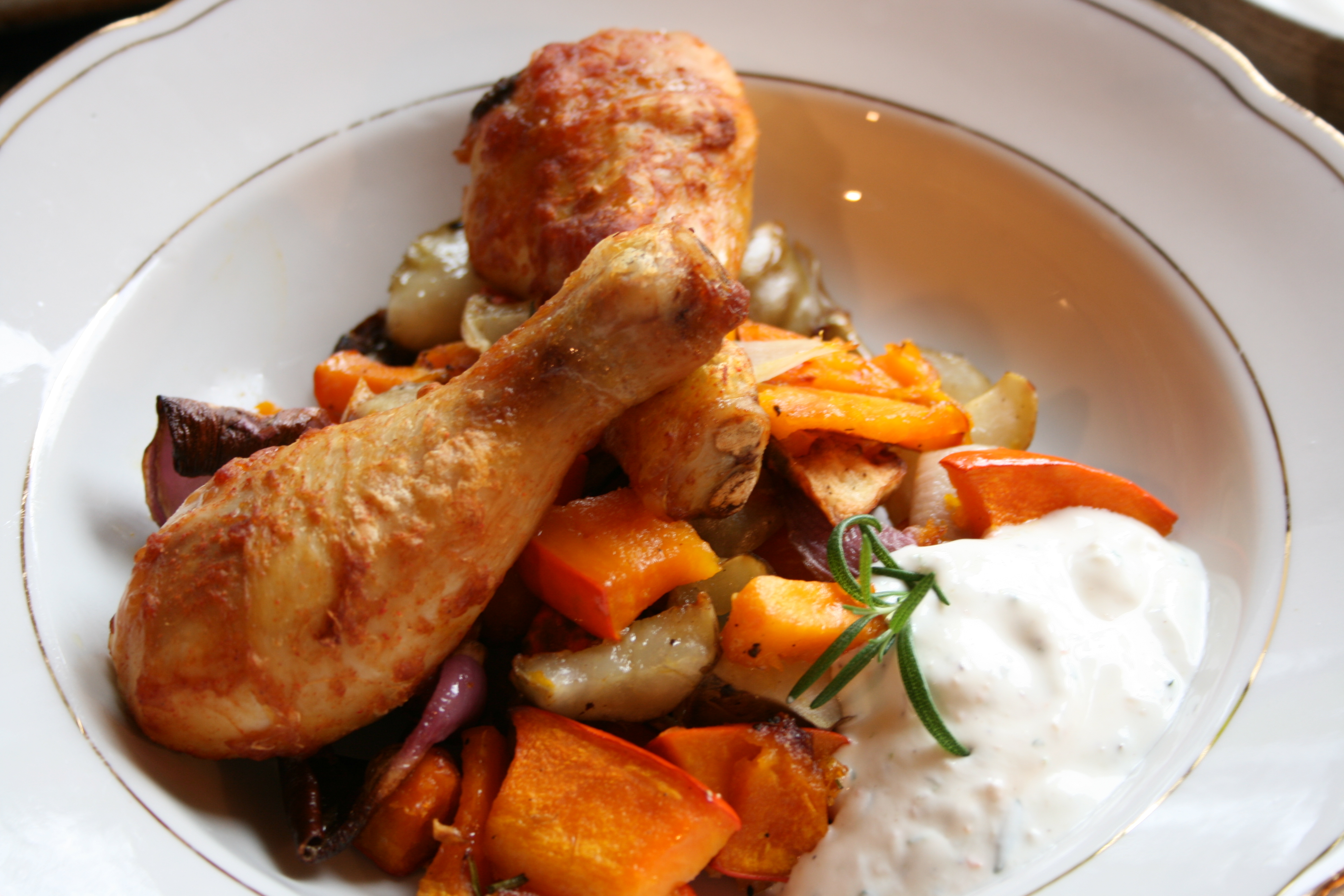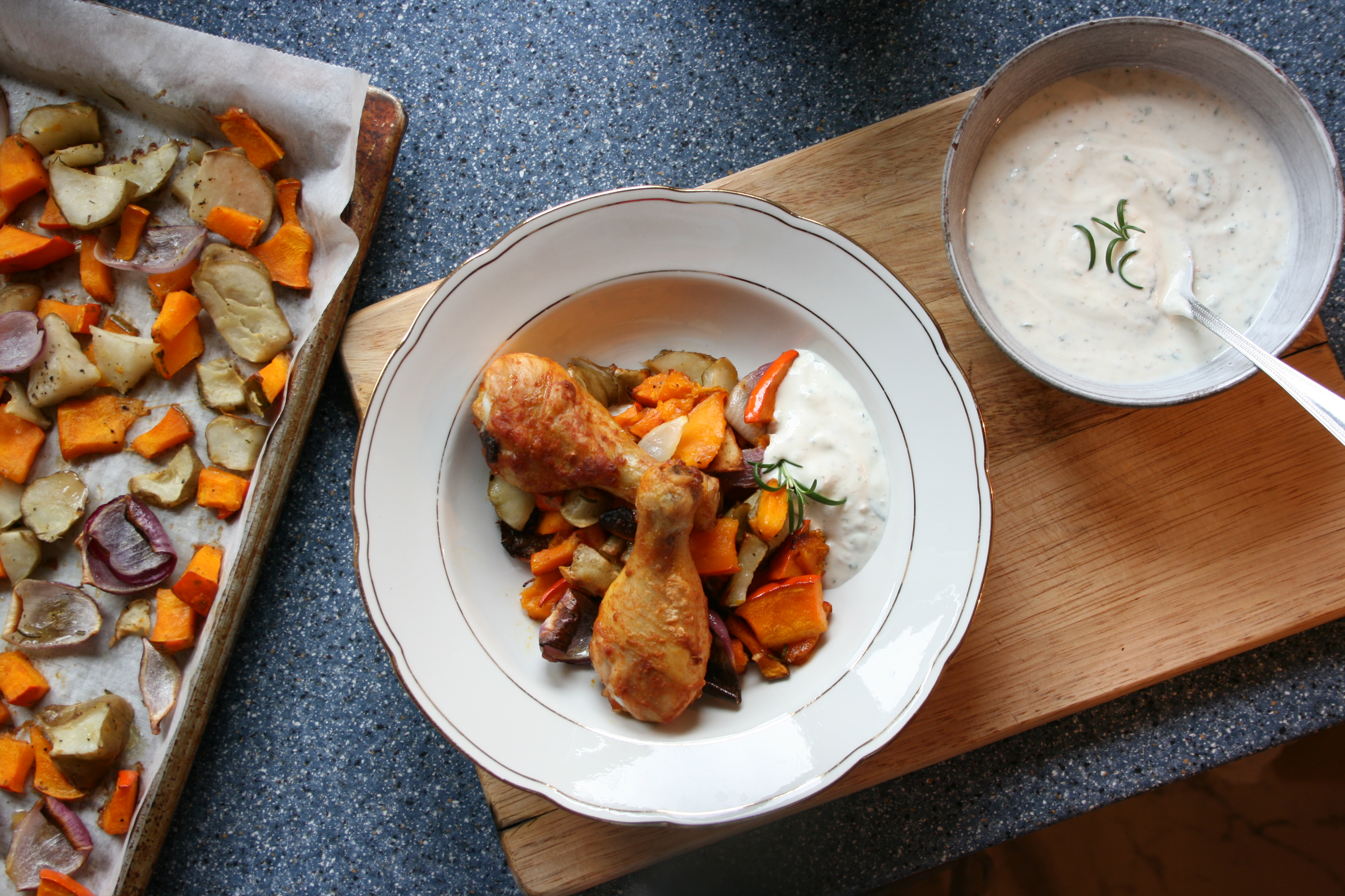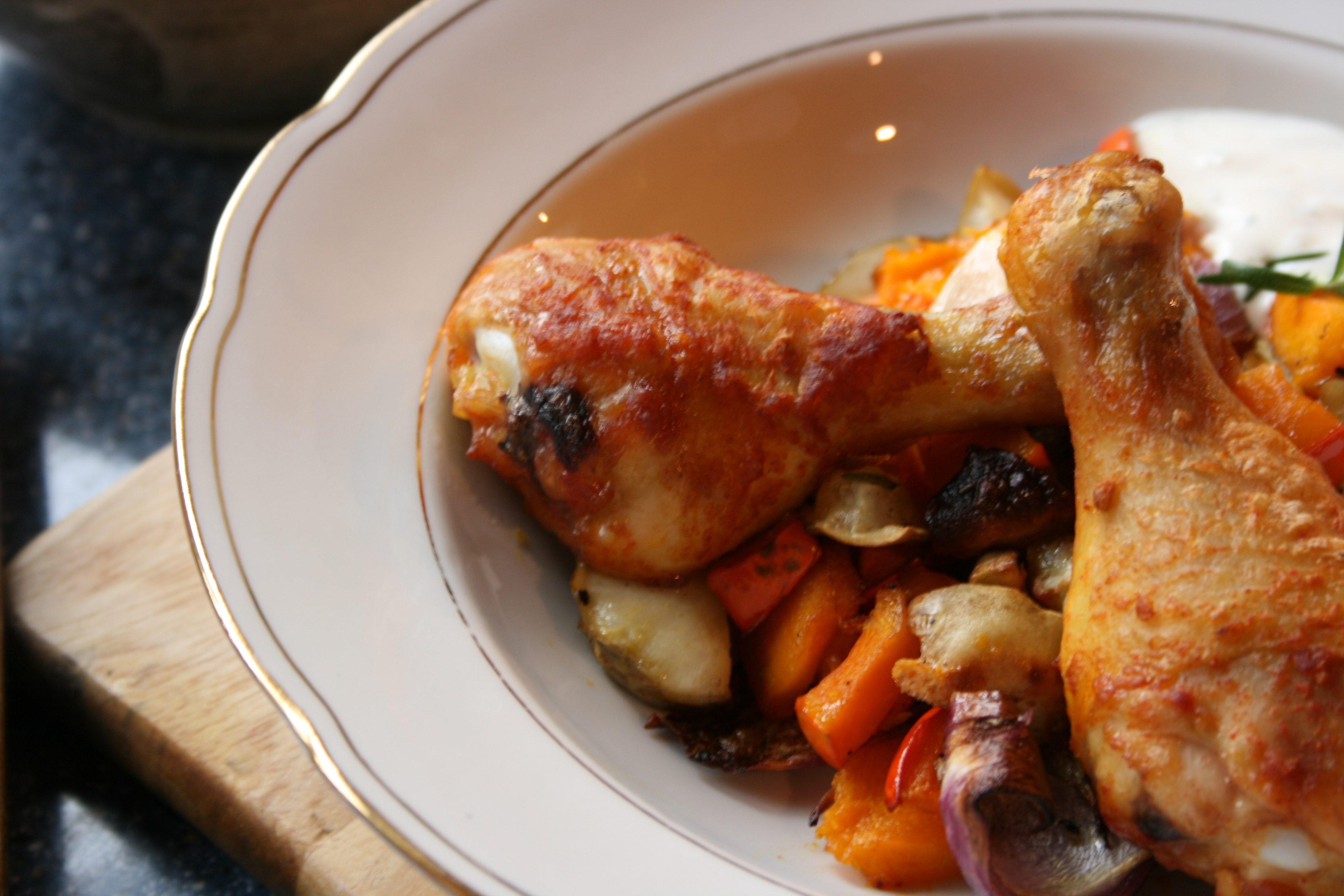 Bei mir gibt es heute Topinambur mit Kürbis und roten Zwiebeln als Ofengemüse, dazu würzige Hendlkeulen mit einem Sauerrahmdip.