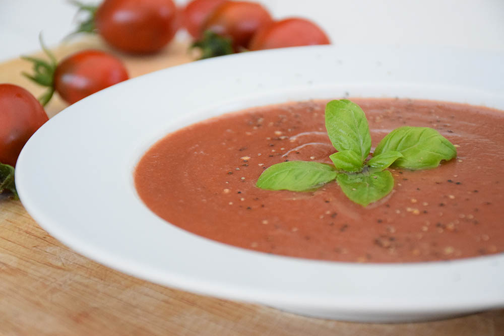 Da an heiße Suppen und Saucen bei den Temperaturen ja nicht zu denken ist, gibt’s heute ein kühlendes und fruchtig frisches Gazpacho. In der Hauptrolle: Vollreife Tomaten, frisch aus dem Garten